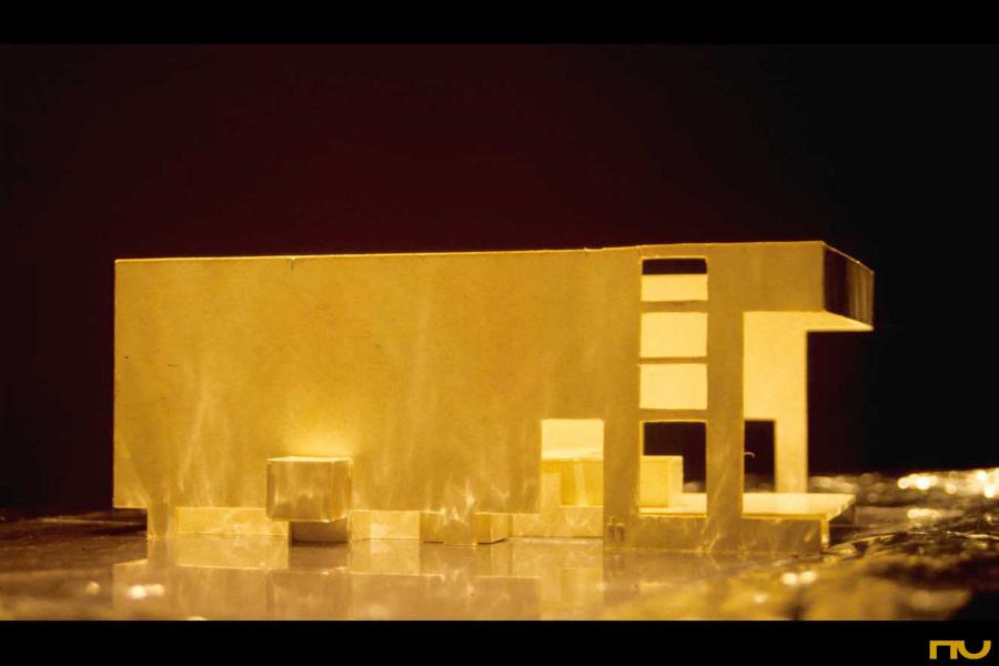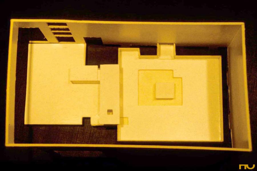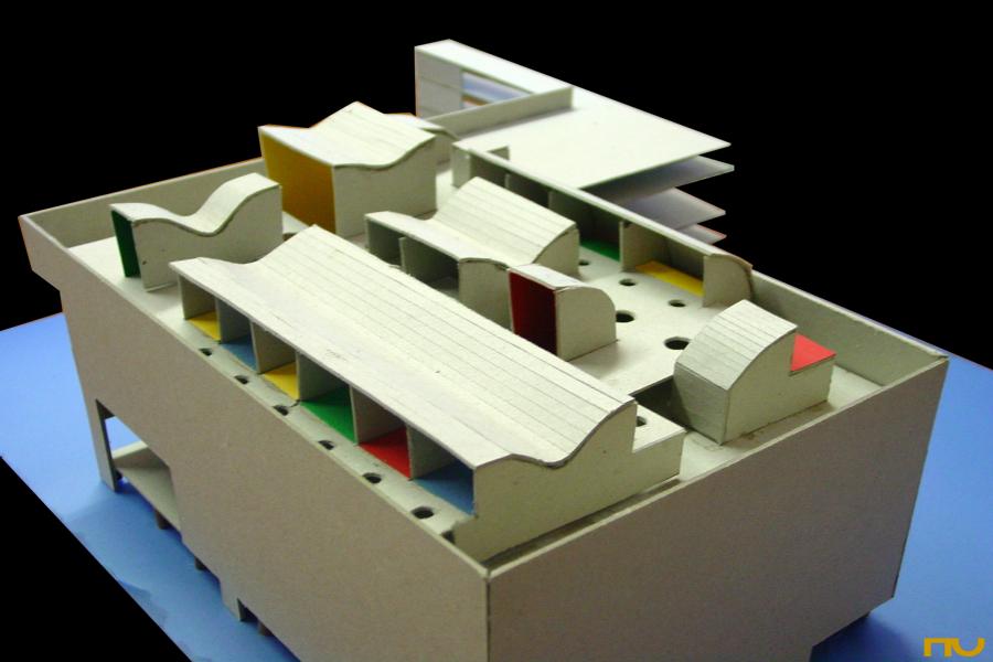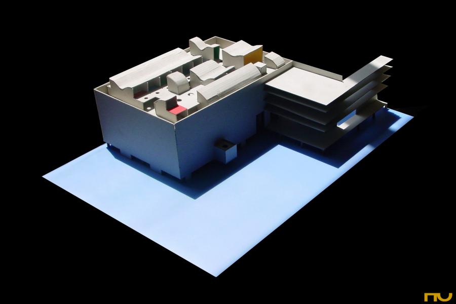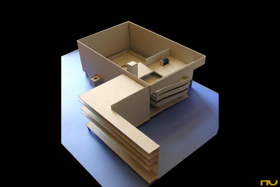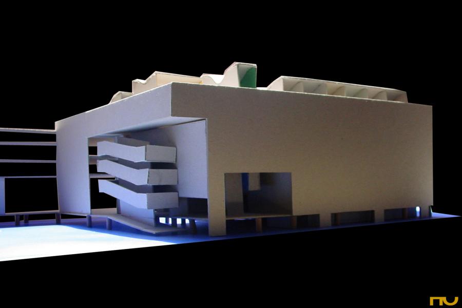 espiral quadrada, formigó, llum zenital, plataforma, promenade, edifici asistencial,