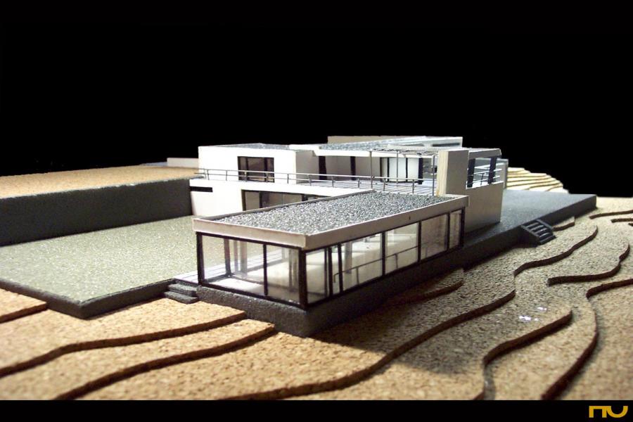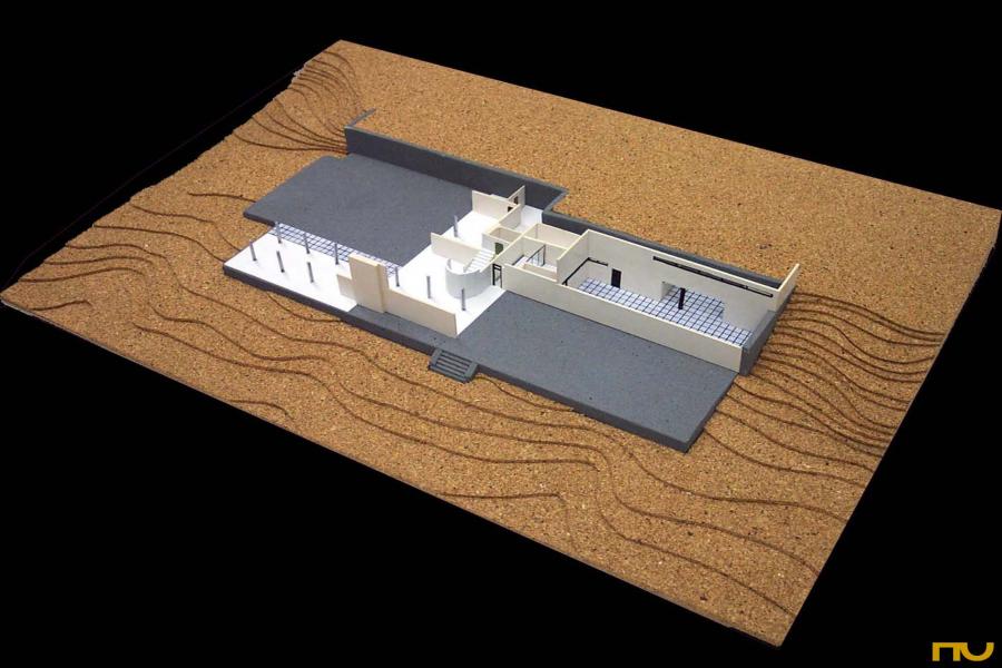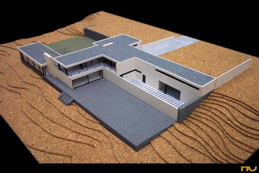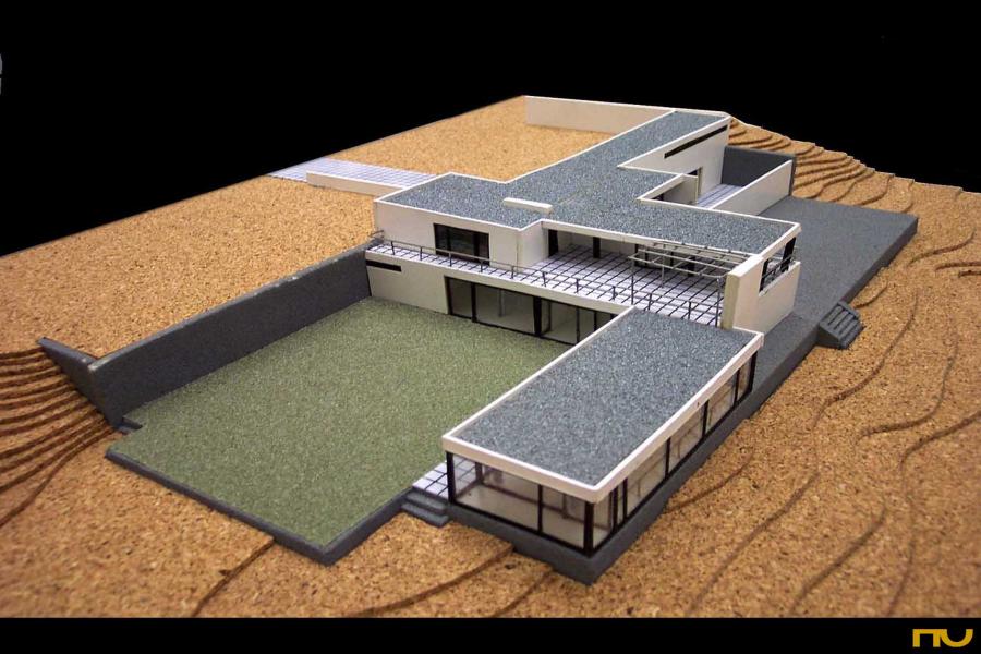 Dado que se encontraba residiendo en Roma, Gericke le encarga la gestión de todo el proceso -aunque no de la decisión final- a Werner March (1894-1976) , autor más tarde del Campo de deportes de Reich para las Olimpiadas de Berlín. El nuevo edificio ocuparía el lugar de una antigua villa demolida para permitir la nueva operación, de la que se habían conservado tres terrazas que se escalonaban hacia el lago. Dentro de este aterrazado, eran de particular importancia los muros de contención dejados en el lugar, en especial el que se tendía entre la calle y el primer desnivel. Las instrucciones del concurso incorporaban un detallado programa para una familia con tres niños y personal de servicio. Los espacios previstos debían ser el de la zona de servicio, un gran salón con estudio anexo, un estudio, tres dormitorios para la familia con conexiones a posibles terrazas, tres dormitorios para el personal de servicio eventual, y un invernadero. El proyecto de Mies consiste en una serie de pabellones alargados, rodeados de verde y respetuosos de los viejos árboles enraizados en el terreno. Los pabellones están conectados entre sí por sus esquinas y vinculados mediante una cubierta común que recuerda el proyecto para el Club de Krefeld sólo que la organización centrífuga en este caso se desarrolla en dos niveles, sirviéndose de las terrazas preexistentes. Justamente por esta razón y por el esquema distributivo adoptado esta casa también recuerda a otro proyecto muy reciente, la Casa Tugendhat (1928-30) aunque formalmente son diferentes. Asimismo se recuperan algunos dispositivos presentes en la Tugendhat como las columnas cruciformes, la escalera caracol de acceso vidriada, el invernadero o las ventanas escamoteables en el pavimento. Sin embargo, puede intuírse como, a diferencia de la mayor rigidez de la Tugendhat, en la Casa Gericke profundiza la idea de fluidez espacial y de vinculación entre sala y patio, un tema que estará muy presente en los coetáneos ejercicios sobre las casas patio. Se accede a la casa desde la calle situada en la parte superior a través de un patio delantero semicubierto. El pasillo de entrada es estrecho y a su izquierda aparece el pequeño estudio solicitado en las bases. En el piso superior -al nivel de la terraza de la calle- se encuentra el cuarto de los niños y el de la institutriz, que se abren sobre una terraza grande del jardín orientada al sur. A la sala de estar se llega por una escalera caracol que nos deja en un espacio intermedio entre el comedor situado hacia este y el salón situado hacia oeste, y cuyo eje acaba en la chimenea. Buscando las mejores vistas hacia el sudoeste, Mies rodea la sala de estar principal con grandes cristales, colocando en el extremo oeste un pequeño jardin de invierno. Desviándose del programa prescrito, Mies hace fluir la sala de estar hacia el jardin ubicado a norte al cual se abre también el dormitorio de los padres, al tiempo que se conecta con el jardín principal hacia el sur. A la zona de servicio se puede llegar por una escalera secundaria o desde el comedor atravesando la despensa separda de la cocina por una mampara de vidrio. Un patio de servicio, con sus altas paredes, unifica la secuencia formada por la despensa, la cocina, el cuarto del personal, la entrada secundaria, el baño de personal, el sótano, y el lavadero. (FA) |
