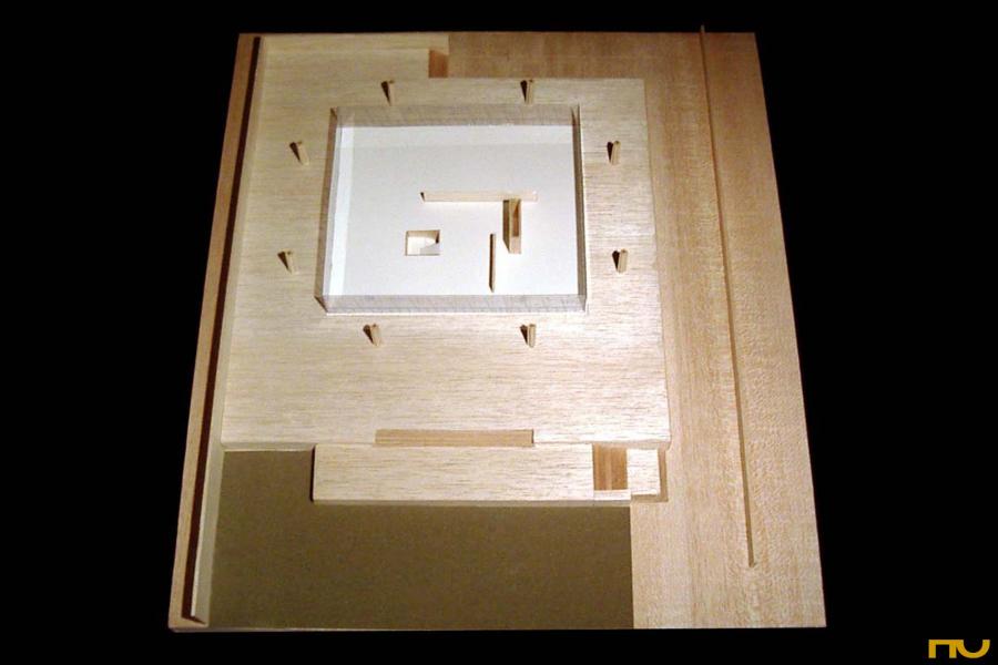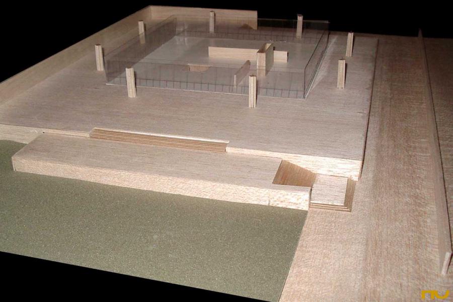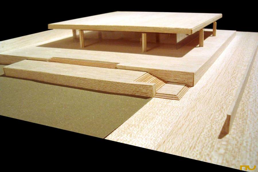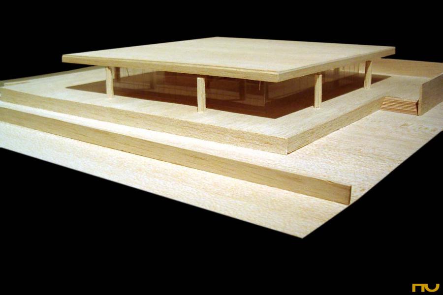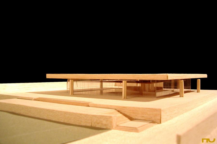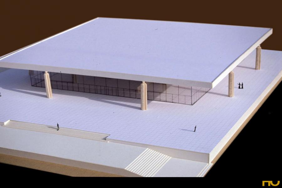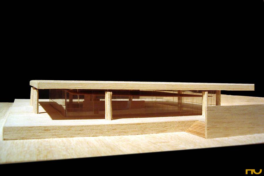 El edificio se encuentra situado en una parcela delimitada por dos calles de tráfico rodado y situada en una zona muy abierta, sin construcciones adosadas a los lÃmites del solar. Topográficamente, existe un desnivel significativo entre una calle y otra, del cual Mies sacará partido al presentar su edificio sobre una plataforma a la que llegamos a través de un juego de escaleras, reforzado plásticamente por dos muros, uno de los cuales sirve de lÃmite con la calle hasta el aparcamiento trasero y el otro, mucho más importante desde el punto de vista proyectual delimita el podio por la cara Sudoeste creando un espacio exterior a modo de patio en el cual Mies prevé alguna escultura. En cualquier caso, el acercamiento nunca es frontal, a lo largo del trayecto de acceso el edificio es percibido en escorzo hasta que nos encontramos muy cerca de la entrada, bajo el pórtico. El programa consistÃa en albergar las oficinas de la empresa productora del Ron Bacardi. El edificio se distribuye en dos plantas diferentes: la planta superior -la más significativa y visible, apoyada sobre la plataforma- estaba destinada a oficinistas y la inferior a las funciones secundarias, como almacenes, cafeterÃa, aseos. La planta superior era totalmente libre, los únicos elementos fijos que encontramos son el corazón de ventilación de suelo a techo, los muros independientes de madera de 2 metros de altura y la escalera que baja al nivel inferior. Con estos elementos fijos parece que se llegan a diferenciar tres espacios. Uno mayor que servirÃa para albergar la gran sala de trabajo, otro situado a la entrada y presidido por la escalera que nos servirÃa de recepción y otro que queda a mano derecha según entramos y que servirÃa de sala de reuniones. Estructuralmente se trata de una cubierta cuadrada de 54 metros de lado realizada en hormigón, sustentada por ocho columnas cruciformes, dos por lado, también de hormigón de 7 metros de altura. La cubierta es una gran retÃcula de vigas postensadas, con un canto de 1,5 metros de canto en el borde y de canto mayor en la zona central de la cubierta, respondiendo al diagrama de momentos en ese punto. Una serie de elementos recuerdan las referencias shinkelianas que enriquecen los artificios de Mies: a la memoria del estilóbato clásico que transmite la plataforma se unen la reducción de sección en las columnas de cruciformes de hormigón en su encuentro con la cubierta resuelto con una articulación que reinventa el capitel, los casetones de la estructura, o la expresión, a modo de metopas sobre un friso, de los rigidizadores del alma de las vigas. Los pilares no se colocan en las esquinas de la cubierta, sino 15 metros hacia dentro, creando un voladizo espectacular que, junto a la colocación retirada 6 metros hacia dentro del cierre de vidrio ahumado, crea una zona oscura en los alzados. Esta estricta separación entre la estructura envolvente y los elementos definidores del espacio, surgida en el temprano proyecto para una sala de conciertos de 1942 volverá a repetirse en el Museo Schäffer en Schweinfurt (1960) o en la Nueva GalerÃa Nacional de BerlÃn (1962-68). (F.A.P.) |