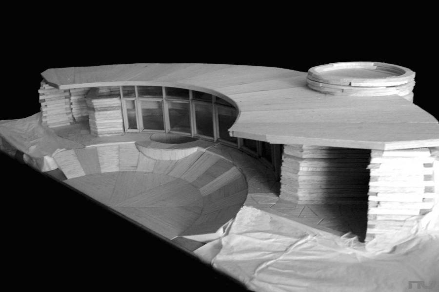 Aquesta casa, situada en un entorn rural de Wisconsin, s'enterra per la part nord i s'obre a un jardà enfonsat descrivint una concavitat envidriada que mira al sud. El terraplè a nord i el gruixut mur de pedra protegeixen a la casa dels vents dominants i li proporcionen calor a l'hivern i fresca a l'estiu. L'accés es realitza pel nord-est mitjançant un túnel que creua el terraplè i que, passant al costat de la paret de la cuina, ens fa arribar al jardà circular. Una vegada allà , accedim a l'interior traspassant qualsevol de les fusteries practicables de fusta, que van des del terra fins a la coberta (uns 4,65 m.) i que col·laboren en el descens de cà rregues. La coberta té una forma accentuada semicircular i crea un voladÃs a sud que deixa entrar els raigs solars a l'hivern i proporciona ombra a l'estiu. El jardÃ, de 7 m. de radi i enfonsat un metre respecte de l'habitatge, actua com a receptacle de l'energia solar. En la planta baixa trobem la sala d'estar, la sala de televisió, el menjador i la cuina, el worksplace wrightià , subtilment diferenciat de la resta per la compressió de l'espai que suposa la presència d'un cilindre de pedra, d'uns 5 m. de dià metre, que conté els dos lavabos, un en planta baixa i l'altre a dalt, i l'escala. La planta superior, la mezzanine , està penjada mitjançant uns tirants de les bigues del sostre, i presenta les habitacions: una principal, a sobre de la cuina, i la possibilitat de crear-ne dos, tres o quatre més. La porció circular del que és l'espai interior té un ample de 5 m, i se situa a un radi de 9 metres. Wright diagrama l'espai dividint la circumferència en 60 parts, obtenint radis cada 6 graus, que ordenen la posició dels eixos de les bigues de la coberta i la mezzanine , les fusteries i la distribució dels diferents elements, xemeneia, estany, cilindre i els envans. No és casual que aquesta casa sigui contemporà nia del Guggenheim, un dels majors assoliments d'aquesta casa és la continuïtat i fluïdesa de l'espai interior, qualitats que el seu exterior no reflecteix d'una manera òbvia: penjat de les bigues del sostre, la mezzanine es penja de les bigues del sostre mitjançant uns tirants metà l·lics que amaga entre els "envans-armari" que separen les habitacions. Després ja n'hi ha prou amb un simple suport al mur nord i unes bones bigues que aportin rigidesa. La galeria de la mezzanine es retira 1 metre del pla de façana, sortint en la planta baixa, i permetent que la calor pugi cap a les habitacions. La visió de les finestres ascendents i el balcó penjant lliurement ens fa percebre l'espai com un tot continu formant un conjunt unitari, total i complet amb el jardà exterior. És molt interessant notar la subtilesa amb què Wright qualifica aquesta heideggeriana porció del món creada a partir d'un sector circular: primer, amb l'hà bil col·locació del cilindre petri crea un dinamisme i una tensió de compressió de l'espai que separa el workspace de la resta de la planta. En el costat esquerre del cilindre es situa la xemeneia, generant l'espai obert de l'estar entorn del foc. Després, amb la presència de l'estany, en la part oest, crea un espai diferenciat de a sala, una TV room o sala de jocs. Tot aquest trà nsit i diferenciació s'efectua de manera suau i contÃnua, a partir dels elements naturals i sense revestiments de cap tipus. (F.A.P.) |