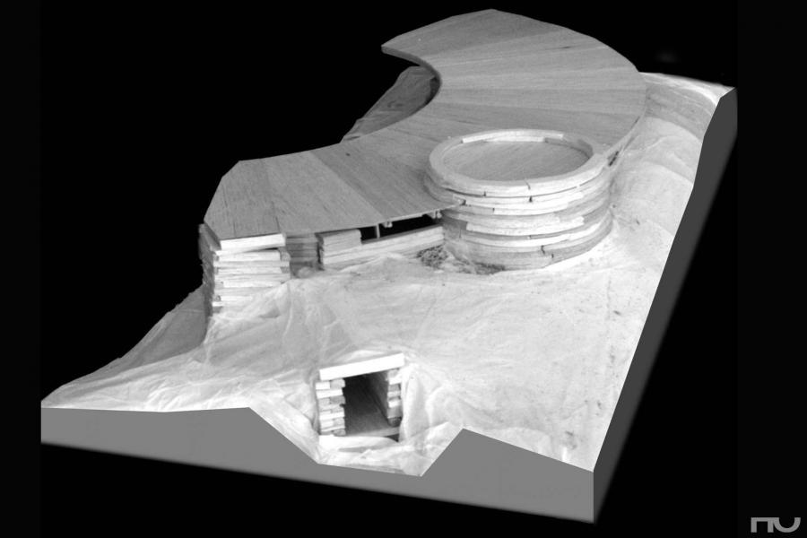 Esta casa, situada en un entorno rural de Wisconsin, se entierra por la parte norte y se abre a un jardÃn hundido describiendo una concavidad acristalada que mira al sur. El terraplén a norte y el grueso muro de piedra protegen a la casa de los vientos dominantes y le proporcionan calor en invierno y fresco en verano. El acceso se realiza por el noreste mediante un túnel que cruza el terraplén y que pasando junto a la pared de la cocina nos hace llegar al jardÃn circular. Una vez ahÃ, accedemos al interior traspasando cualquiera de las carpinterÃas practicables de madera, que van desde el suelo hasta la cubierta (unos 4,65 m.) y que colaboran en el descenso de cargas. La cubierta tiene una acentuada forma semicircular y crea un voladizo a sur que deja entrar los rayos solares en invierno y proporciona sombra en verano. El jardÃn de 7 m. de radio y hundido un metro respecto de la vivienda, actúa como cuenco receptor de la energÃa solar. En la planta baja encontramos el estar, la sala de televisión, el comedor y la cocina, el worksplace wrightiano, sutilmente diferenciado del resto por la compresión del espacio que supone la presencia de un cilindro de piedra, de unos 5 m. de diámetro, que contiene los dos lavabos, uno en planta baja y el otro arriba, y la escalera. La planta superior, la mezzanine, está colgada mediante unos tirantes de las vigas del techo, y presenta las habitaciones: una principal, encima de la cocina, y la posibilidad de crear dos, tres o cuatro más. La porción circular de lo que es el espacio interior tiene un ancho de 5 m, y se sitúa a un radio de 9 metros. Wright diagrama el espacio dividiendo la circunferencia en 60 partes, obteniendo radios cada 6 grados, que ordenan la posición de los ejes de las vigas de la cubierta y la mezzanine , las carpinterÃas y la distribución de los diferentes elementos, chimenea, estanque, cilindro y los tabiques. No es casual que esta casa sea contemporánea del Guggenheim, uno de sus mayores logros de esta casa es la continuidad y fluidez del espacio interior, cualidades que su exterior no refleja de una manera obvia: colgado de las vigas del techo, la mezzanine se cuelga de las vigas del techo mediante unos tirantes metálicos que esconde entre los "tabiques-armario" que separan las habitaciones. Luego ya basta un simple apoyo en el muro norte y unas buenas vigas que aporten rigidez. La galerÃa de la mezzanine se retira 1 m. del plano de fachada, asomándose a la planta baja, y permitiendo que el calor suba hacia las habitaciones. La visión de las ventanas ascendentes y el balcón colgando libremente nos hace percibir el espacio como un todo continuo formando un conjunto unitario, total y completo con el jardÃn exterior. Es muy interesante notar la sutileza con que Wright cualifica esta heideggeriana porción del mundo creada a partir de un sector circular: primero, con la hábil colocación del cilindro pétreo crea un dinamismo y una tensión de compresión del espacio que separa el workspace del resto de la planta. Al lado izquierdo del cilindro se sitúa la chimenea, generando el espacio abierto del estar en torno al fuego. Después, con la presencia del estanque, en la parte oeste, crea un espacio diferenciado del estar, una TV room o sala de juegos. Todo este tránsito y diferenciación se efectúa de manera suave y continua, a partir de los elementos naturales y sin revestimientos de ningún tipo. (F.A.P.) |