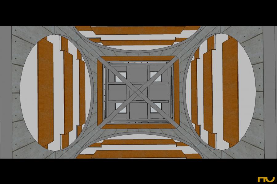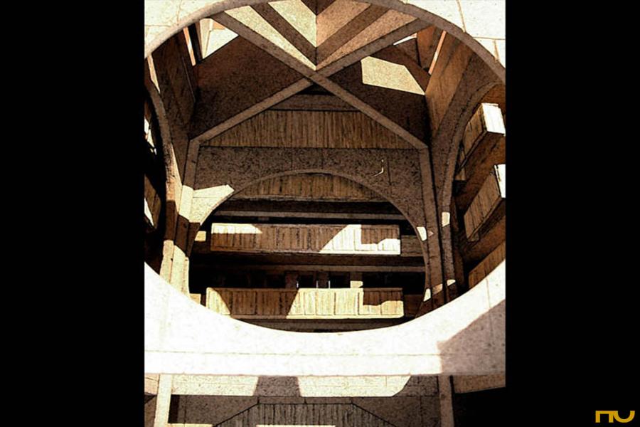 La Biblioteca -el proyecto ideal para un arquitecto, según Boullée- es más rígidamente clásica que sus trabajos anteriores: una planta cuadrada dividida en nueve cuadrados menores, con un cuadrado libre al centro, o un gran cubo (34 x 34 x 24) con un cubo central vacío, o volviendo a Boulée, un vacío esférico. No hay mayores cambios en las tres versiones que Kahn desarrolla entre 1966 y 1968: la primera hasta octubre 1966, la segunda hasta Julio 1967 y la tercera, hasta noviembre1968. La primera entrega muestra un edificio dividido en tres partes inscriptas en una planta cuadrada: una zona interior de hormigón de tres alturas rematada por un techo piramidal, una zona intermedia con entrepisos para el almacenamiento de libros donde predomina la madera y una zona exterior conteniendo espacios de trabajo y lectura, expresada por una fachada de ladrillos. Esta morfología estructural, encargada de diferenciar la forma y el uso de los espacios se mantiene invariable a lo largo de las tres etapas mencionadas.
