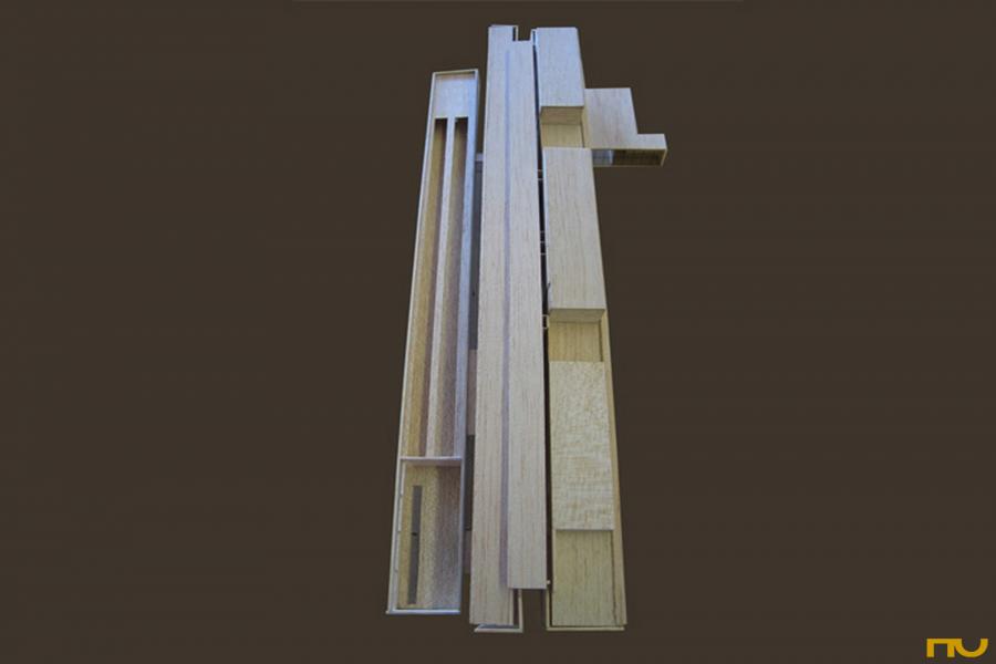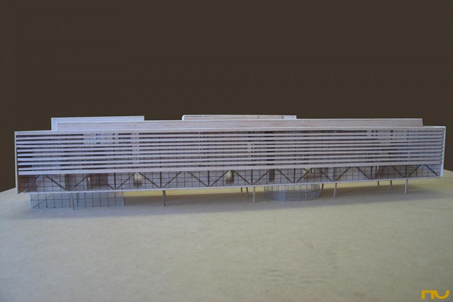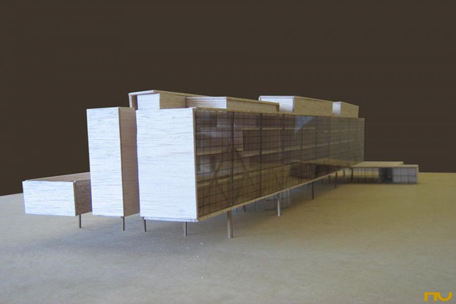 capsa, edifici cultural, edifici docent, horitzontalitat, llum zenital, voladiu, planta lliure, transparència, rigor, marc estructural, estructura porticada, vidre, acer, proporció,