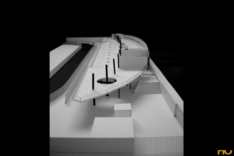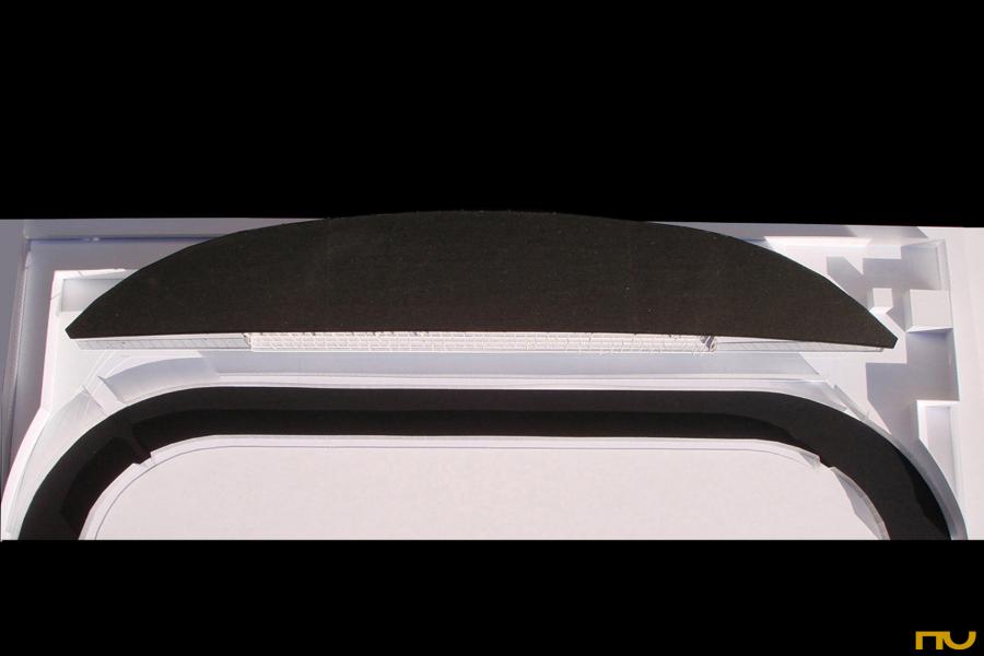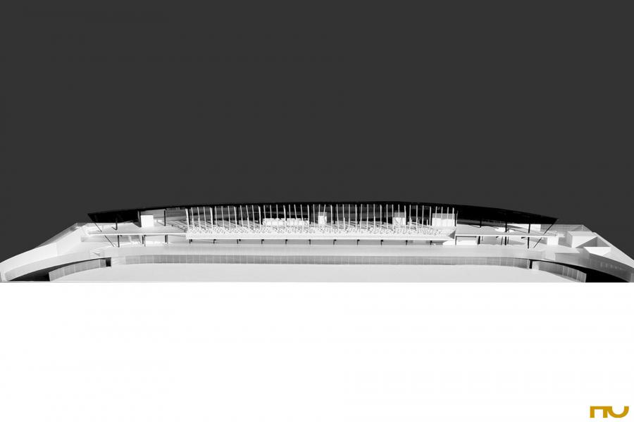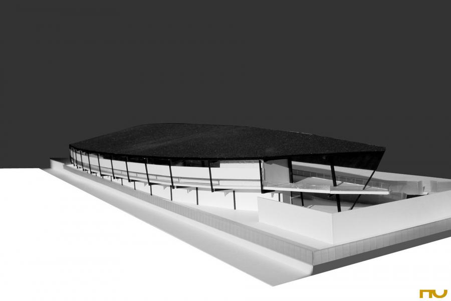 La forma general de l’edifici està fortament condicionada per la solució estructural que determina la presència de tres figures surants: la làmina parabòlica de la coberta, l’estriat vertical dels brise-soleils, i el conjunt de graderies i terrassa. La làmina de la coberta és una forma reglada portada a terme pel desplaçament d’una recta entre dues línies directrius: una parabòlica en planta i horitzontal en alçat (sobre la façana exterior de l’edifici, cap el carrer Riera d’Horta) i una altra de parabòlica en alçat i recta en planta (la façana interior). Aquestes dues línies, de diferent llargària (107m sobre la recta paral·lela a la pista), es divideixen en parts iguals, que unides defineixen les alineacions de les crugies. Seguint aquests trajectes radials es distribueix l’estructura principal, composta per 18 bigues metàl•liques de cantell i longitud variable inclinades cap el carrer segons el mateix angle i recolzades sobre una única línia de pilars a la zona central de la planta.