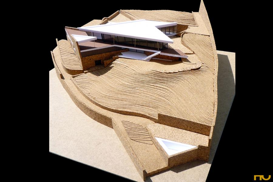 Els espais de servei (safareig, cuina, magatzems, habitacions) es porten cap a l’interior de la planta, en contacte amb els murs de contenció ubicats a nord i il·luminats des de la perifèria o a través d’un pati triangular de generoses dimensions, que permet deixar als dormitoris i sala d’estar en les millors condicions de vistes i assoleig. Així, els murs principals s’estenen cap a la vista sud-est format una façana de 27m, completament vidriada, cap al mar.