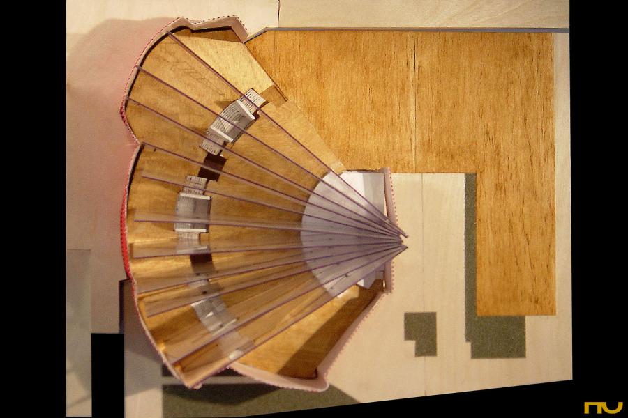addició, agrupació, asimetría, doble pell, edifici cultural, forma corba, fusta, polaritat,
