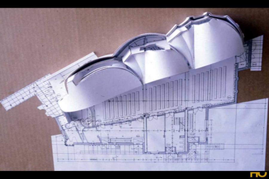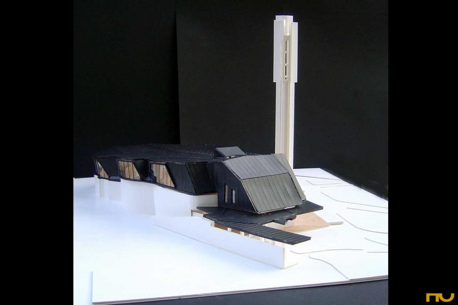 addició, doble pell, edifici religiós, forma corba, orgànic, trapezi,